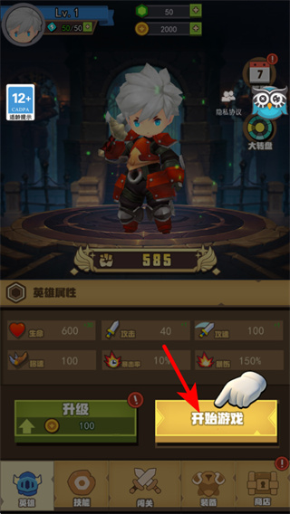 1、在角色界面查看英雄屬性,確認(rèn)當(dāng)前的生命、攻擊等數(shù)值后,點擊開始游戲按鈕進(jìn)入關(guān)卡,這是開啟冒險的核心步驟。