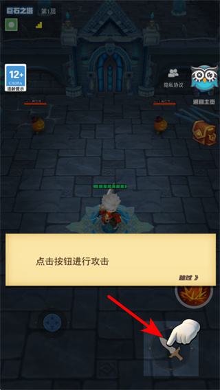 2、進(jìn)入關(guān)卡后,按照界面提示點擊攻擊按鈕,對場景中的敵人發(fā)起攻擊,通過持續(xù)點擊積累傷害,逐步擊敗當(dāng)前區(qū)域目標(biāo)。