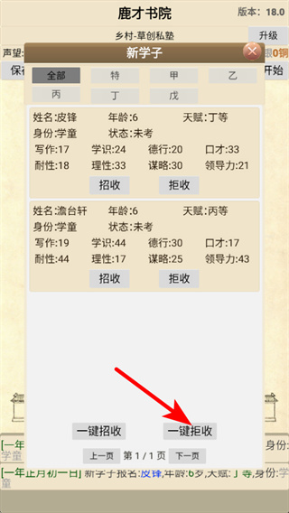 3、當(dāng)新學(xué)童列表更新后,篩選天賦較高的學(xué)童進行招收,同時用一鍵拒收快速過濾不符合需求的學(xué)員,優(yōu)化書院的學(xué)員質(zhì)量。