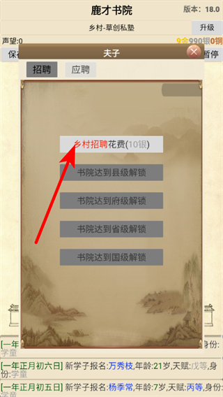 2、進入夫子界面,選擇對應(yīng)的招聘選項如鄉(xiāng)村招聘花費10銀解鎖新的學(xué)童招募渠道,通過資源提升書院的招生層級,獲取天賦學(xué)員。