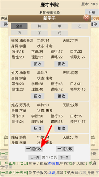 1、在新學(xué)子界面查看學(xué)童的天賦與屬性,根據(jù)自身需求選擇單個學(xué)童點擊招收,或用一鍵招收快速納入多個學(xué)童,擴充學(xué)員規(guī)模。