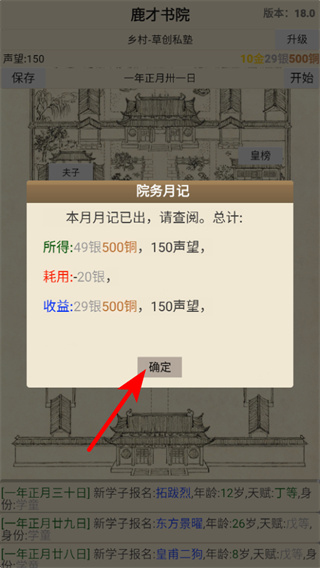 4、每月結(jié)算時查看院務(wù)日記,確認(rèn)本月的所得耗損與收益后點擊確定,完成月度結(jié)算流程,持續(xù)積累資源用于書院升級學(xué)童培養(yǎng)。