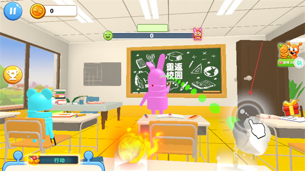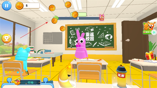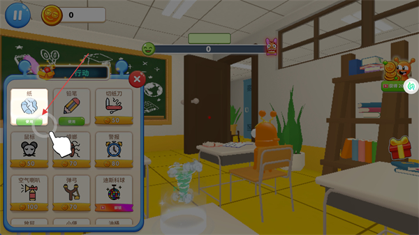 2、進入關(guān)卡后打開行動界面,選擇紙團、鉛筆等整蠱道具,點擊道具即可對目標觸發(fā)整蠱操作,借助道具推進整蠱流程。