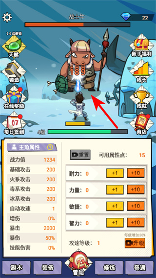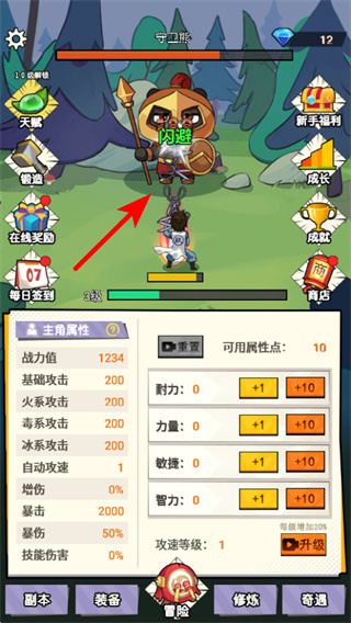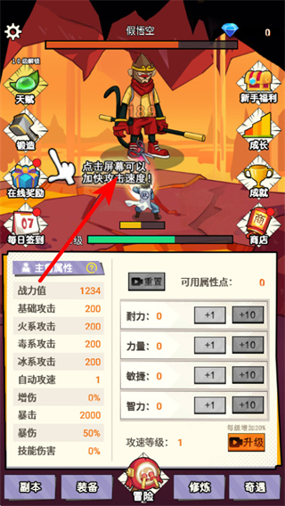 2、進(jìn)入角色界面后,通過點(diǎn)擊屏幕加快攻擊速度,同時(shí)查看主角屬性面板,利用可用屬性點(diǎn)提升耐力,增強(qiáng)角色的戰(zhàn)斗能力。