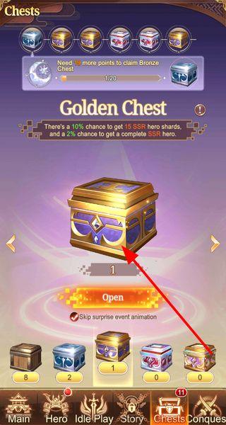 3、寶箱招募可查看不同寶箱的獲取條件,點擊開啟黃金寶箱,有概率獲得完整SSR英雄,同時可切換不同類型的寶箱。