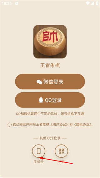 1、進(jìn)入王者象棋,勾選協(xié)議點(diǎn)擊手機(jī)號,進(jìn)入手機(jī)號登錄頁面。