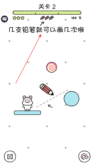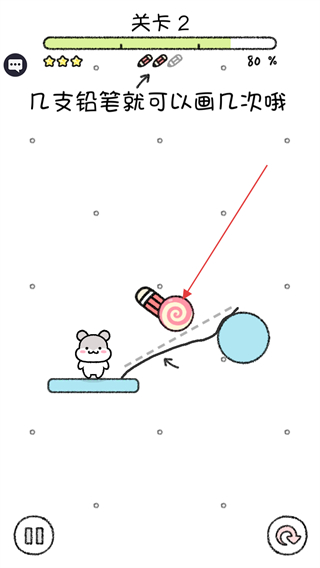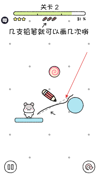 2、用鉛筆繪制曲線連接倉(cāng)鼠與藍(lán)色圓球,消耗鉛筆次數(shù),推進(jìn)關(guān)卡進(jìn)度。