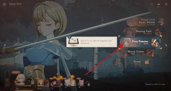 3、技能選擇界面,根據(jù)提示使用增益類技能,這類技能能為隊友提供加成效果,使用時需消耗對應(yīng)點數(shù)。