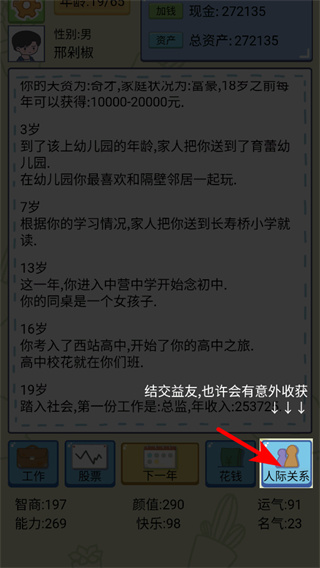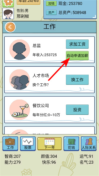 4、在不同功能界面間切換操作時(shí),優(yōu)先完成收益類操作如投資、加薪,再進(jìn)行社交類互動(dòng),合理分配每年的操作優(yōu)先級(jí),穩(wěn)步提升資產(chǎn)與屬性數(shù)值。