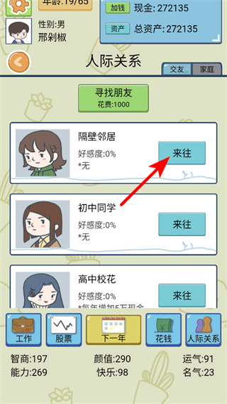 1、進(jìn)入社會(huì)階段后,點(diǎn)擊人際關(guān)系按鈕進(jìn)入社交界面,選擇已有聯(lián)系人如隔壁鄰居點(diǎn)擊來往,消耗少量現(xiàn)金提升好感度,積累人際關(guān)系資源以解鎖后續(xù)互動(dòng)。