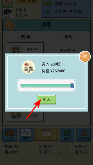 2、在股票界面選擇合適的股票如爸爸網(wǎng)購(gòu),調(diào)整持股數(shù)量后點(diǎn)擊買入,借助投資獲取資產(chǎn)收益,注意結(jié)合自身現(xiàn)金狀況選擇投資規(guī)模,避免資金過度消耗。