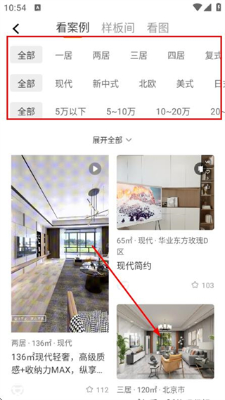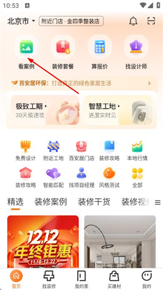 1、在該裝修APP首頁點擊看案例選項,進入看案例頁面。