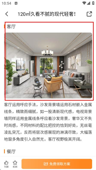 3、在案例詳情頁面查看房間區(qū)域的裝修效果圖,及對應(yīng)的文字介紹內(nèi)容。