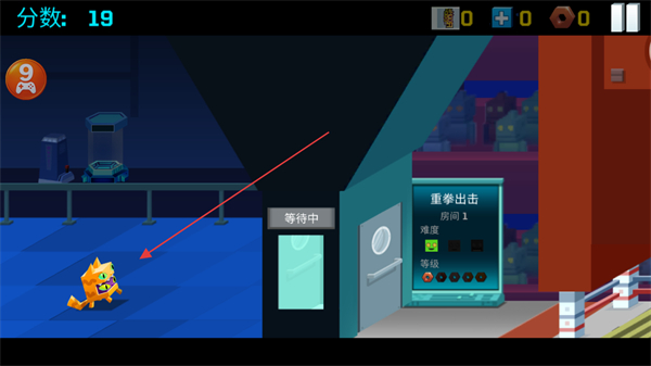 1、操控黃色角色移動,等待進(jìn)入重拳出擊房間,積累分?jǐn)?shù)至19。