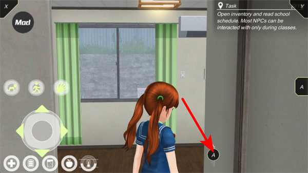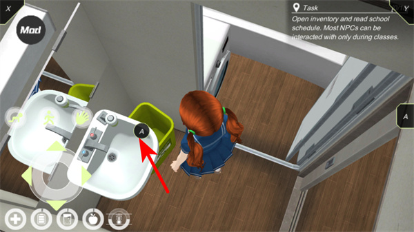 1、在室內(nèi)場景中,通過左側(cè)移動控件操控角色靠近互動區(qū)域,點擊對應(yīng)按鈕觸發(fā)場景交互,推進流程的基礎(chǔ)操作,可解鎖后續(xù)功能界面。