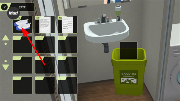3、移動角色到洗漱臺等設(shè)施附近,點擊互動按鈕進入物品界面,查看可獲取的道具如紙巾,收集這些物品以補充背包資源,提升便利。