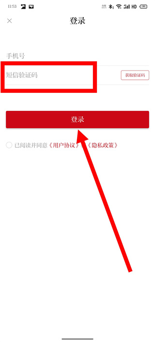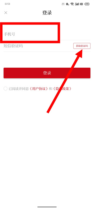 3、在登錄頁面,輸入手機(jī)號(hào),點(diǎn)擊獲取驗(yàn)證碼。