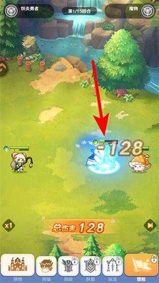 4、戰(zhàn)斗過程中,角色會自動釋放技能攻擊怪物如圖中技能造成128點(diǎn)傷害,這是推進(jìn)戰(zhàn)斗的核心環(huán)節(jié),持續(xù)攻擊直至擊敗怪物,即可完成挑戰(zhàn)并獲取對應(yīng)的獎勵資源。