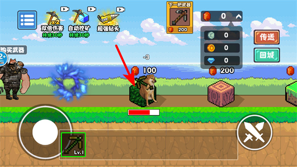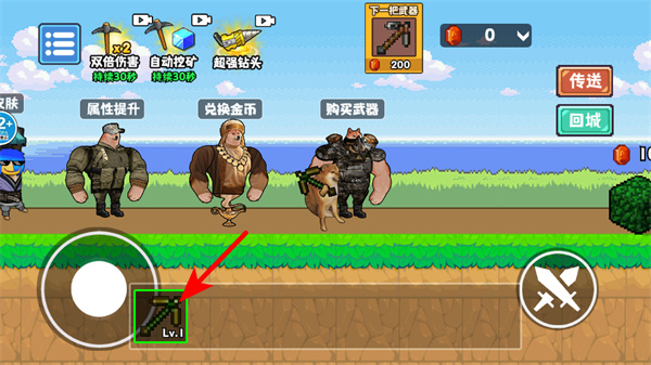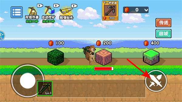 2、操控角色移動到場景中的資源點如樹木、石塊附近,點擊右側的攻擊按鈕進行采集,獲取貨幣或材料,用后續(xù)升級兌換。