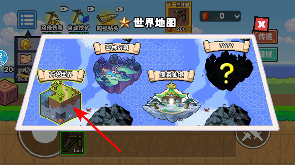 4、打開世界地圖界面后,選擇初始區(qū)域如方塊世界進入對應場景,不同區(qū)域會提供不同類型的資源,優(yōu)先從初始區(qū)域開始探索。