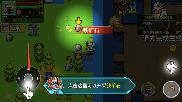 1、用左下角搖桿操控角色移動(dòng)、靠近礦石處、準(zhǔn)備完成挖鐵礦的主線任務(wù)、推進(jìn)荒島求生的游戲進(jìn)程。