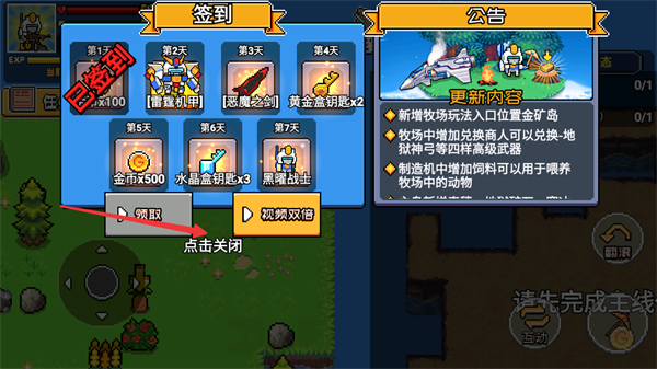 4、進(jìn)入簽到界面、點(diǎn)擊領(lǐng)取獲取獎(jiǎng)勵(lì)、隨后點(diǎn)擊關(guān)閉、繼續(xù)荒島求生的游戲進(jìn)程。