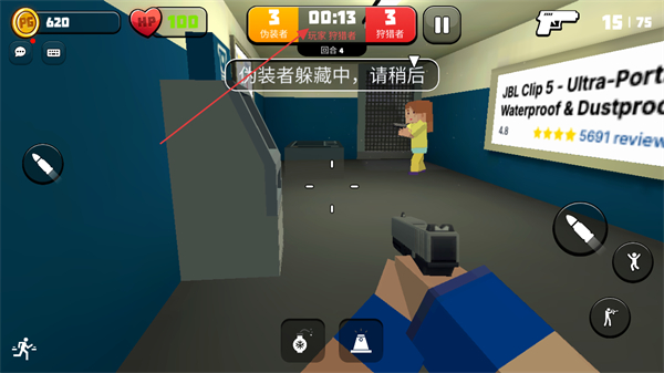 1、偽裝者隱藏階段等待后,以獵人身份在場(chǎng)景內(nèi)搜尋目標(biāo),準(zhǔn)備攻擊。