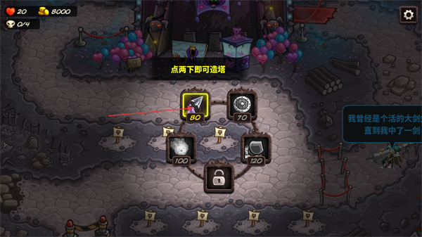 4、根據(jù)提示點(diǎn)兩下即可建造塔,在造塔界面選對(duì)應(yīng)塔型,點(diǎn)兩下即可完成該防御塔的建造以防御敵人。
