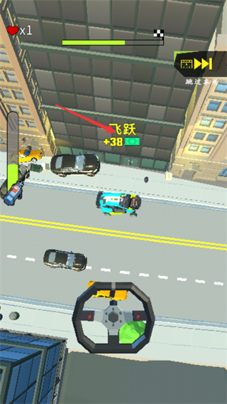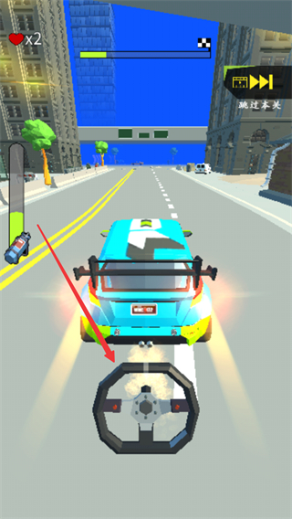 1、通過方向盤操控賽車、在城市道路行進、關注上方進度條、推進瘋狂沖刺的關卡進程。