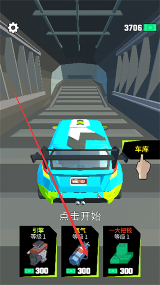 4、進入車庫界面、點擊開始、可升級引擎等部件、開啟瘋狂沖刺的新關卡進程。