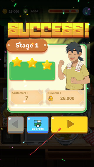 4、完成關(guān)卡后,獲得三星評價與對應(yīng)收益,可點擊黃色按鈕進入下一關(guān),也可選擇upgrade選項升級設(shè)施。