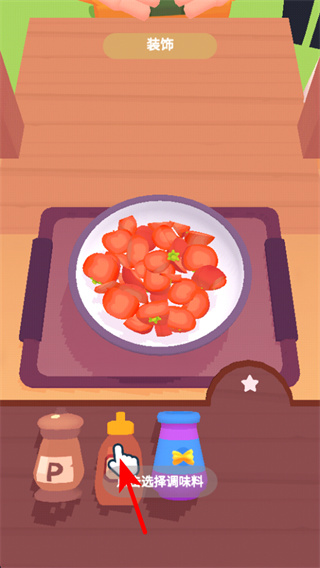 4、完成食材處理后,進入裝飾環(huán)節(jié),選擇對應的調(diào)味料添加到菜品中,豐富菜品的口味與外觀,提升顧客的滿意度,完成當前菜品制作任務。