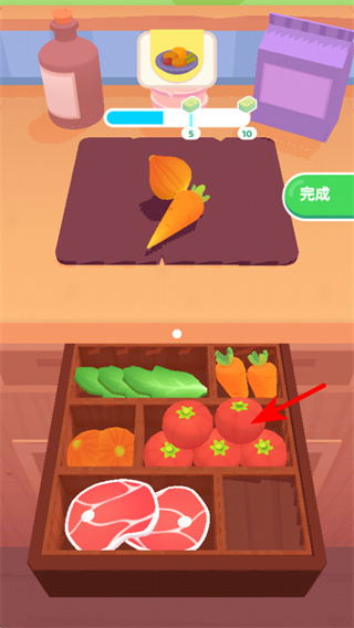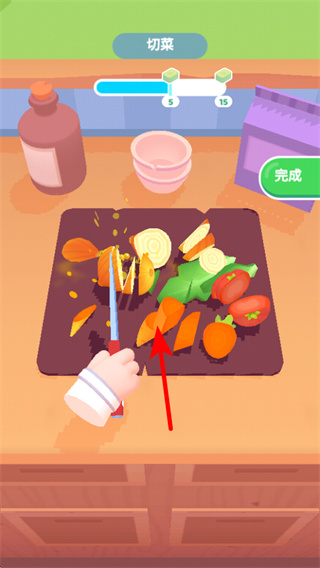 2、進(jìn)入切菜環(huán)節(jié)后,操作刀具對(duì)已選食材進(jìn)行切割,將食材處理成合適的形狀與大小,完成切割后點(diǎn)擊完成,進(jìn)入步驟,保持操作的流暢性以提升效率。