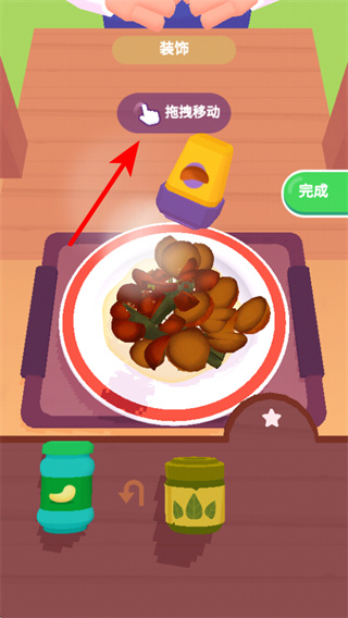 4、完成炒制后進(jìn)入裝飾環(huán)節(jié),通過(guò)拖拽操作添加調(diào)味料或裝飾配料,調(diào)整菜品的外觀與口味,裝飾完成后點(diǎn)擊完成,提交菜品以獲取對(duì)應(yīng)的獎(jiǎng)勵(lì)與評(píng)價(jià)。