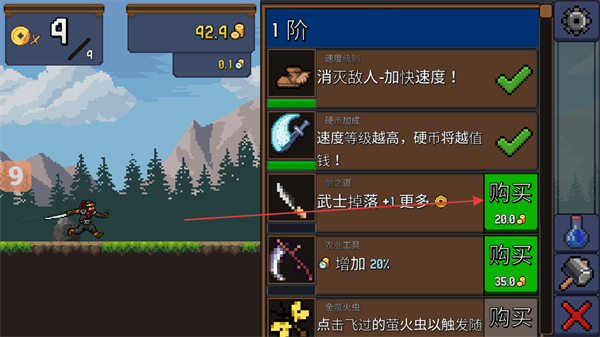 4、進(jìn)入升級界面,消耗金幣購買武士掉落等技能,進(jìn)一步強(qiáng)化角色收益。
