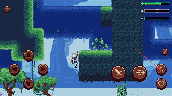 1、在懸崖邊上,點(diǎn)擊跳躍鍵靠近墻面可以進(jìn)行攀爬,掛在懸崖上躲避攻擊。
