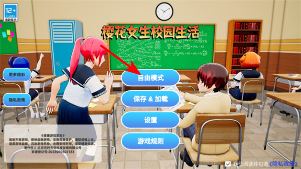 1、在游戲初始界面,勾選隱私政策后點擊自由模式選項進入玩法,這是開啟校園生活探索的基礎(chǔ)步驟,在自由模式中體驗各類校園互動。
