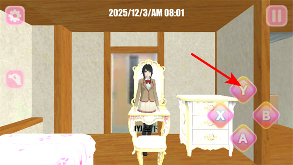 2、進入室內(nèi)場景后,通過界面右側(cè)的按鍵如Y、X觸發(fā)互動操作如坐下,熟悉場景內(nèi)的交互邏輯,借助這些操作完成角色的基礎(chǔ)狀態(tài)調(diào)整。