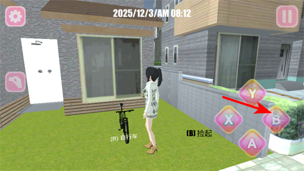 3、在室外場景中,靠近道具如自行車后點擊對應(yīng)按鍵如B進行拾取,獲取這類交通工具可提升移動效率,方便快速穿梭校園的不同區(qū)域。
