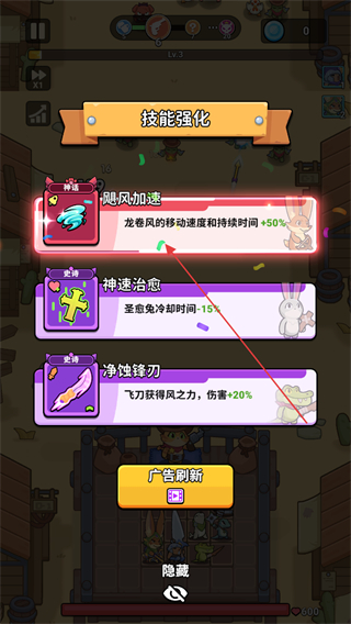 4、通過擊殺野怪可以獲得等級的提升,每當(dāng)?shù)燃壧嵘患墪r,都可以選擇一個技能強(qiáng)化我方的攻擊力。
