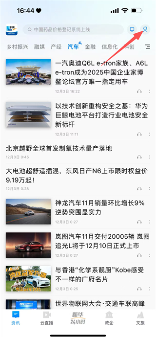 1、在新華網(wǎng)資訊頁面,點擊右上角的個人中心入口,進入個人頁面。