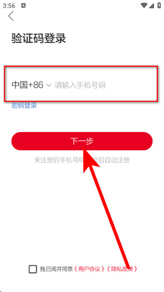 3、在驗證碼登錄頁面,輸入手機號碼,勾選協(xié)議后,點擊下一步。