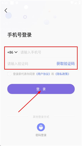 3、在登錄頁面填寫手機號和驗證碼,勾選協(xié)議后,點擊登錄完成賬號登錄操作。