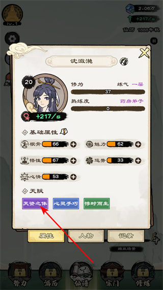 1、在角色界面中,查看基礎屬性與天賦的加成效果,了解當前角色的核心特質,養(yǎng)成系統(tǒng)針對性強化根骨、悟性等屬性。