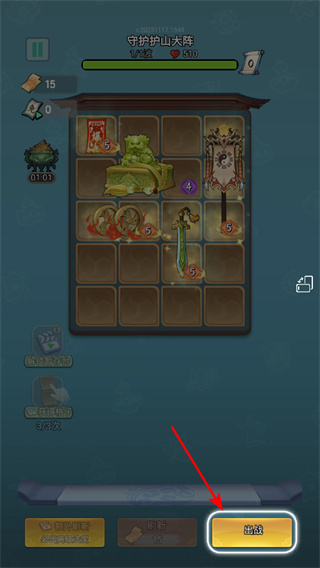 2、完成道具布置后點(diǎn)擊出站按鈕進(jìn)入關(guān)卡,進(jìn)入戰(zhàn)斗場景后留意界面提示,了解當(dāng)前關(guān)卡的目標(biāo)如守護(hù)大陣,明確戰(zhàn)斗的核心任務(wù)方向。
