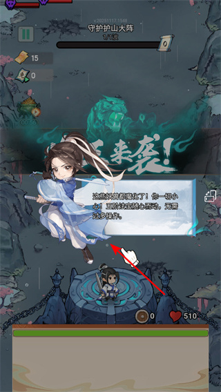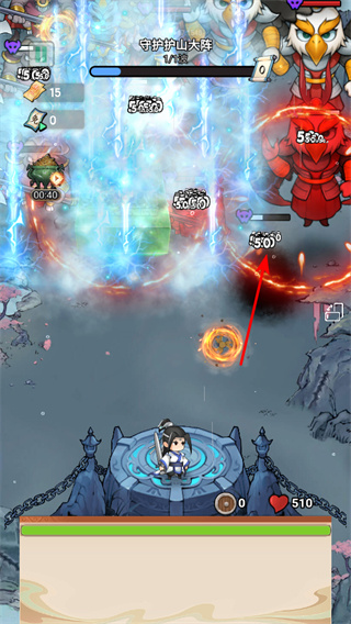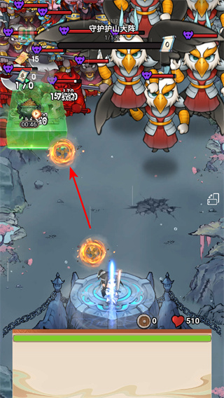 3、戰(zhàn)斗過程中,點(diǎn)擊角色或技能區(qū)域釋放攻擊,借助已布置的道具效果如范圍傷害擊退敵人,同時關(guān)注大陣的血量,避免被敵人突破防御。