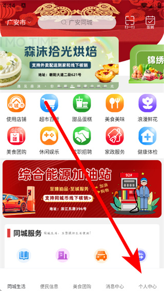 1、打開(kāi)廣安同城,點(diǎn)擊底部的個(gè)人中心,進(jìn)入個(gè)人中心頁(yè)面。