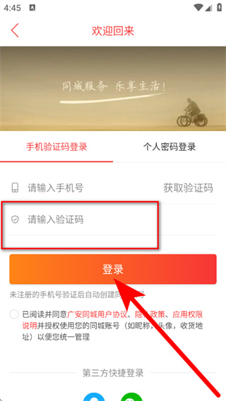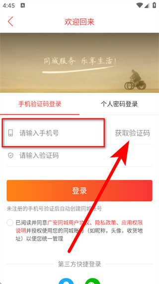 3、在手機(jī)驗(yàn)證碼登錄頁(yè)面,輸入手機(jī)號(hào),點(diǎn)擊獲取驗(yàn)證碼。