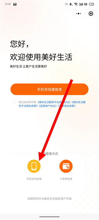 2、在登錄方式選擇界面,點(diǎn)擊手機(jī)號(hào)碼登錄,進(jìn)入對應(yīng)登錄頁。