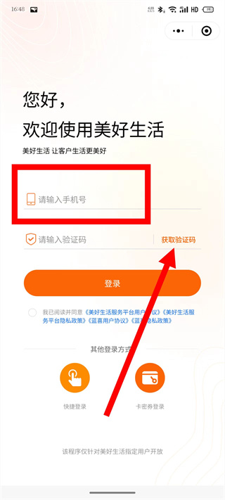 3、在手機(jī)號(hào)碼登錄頁面,輸入手機(jī)號(hào),點(diǎn)擊獲取驗(yàn)證碼。